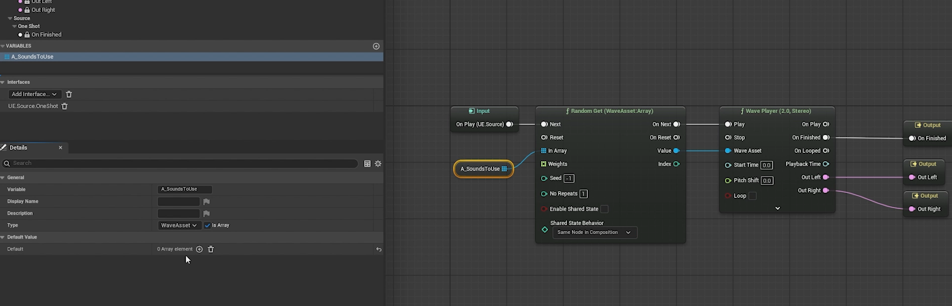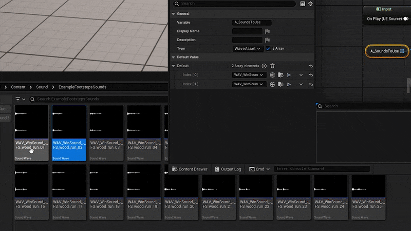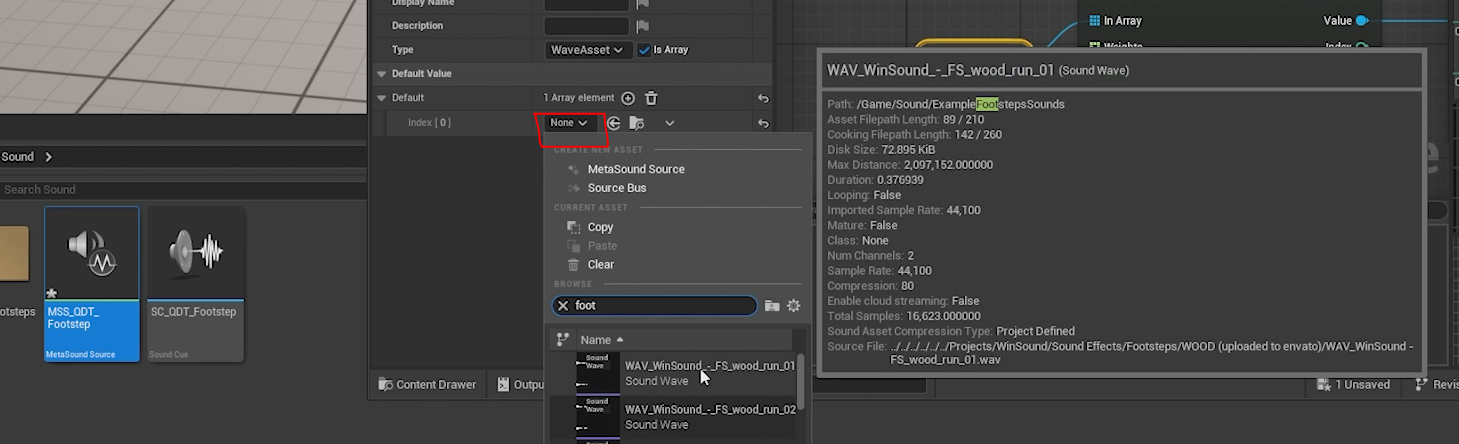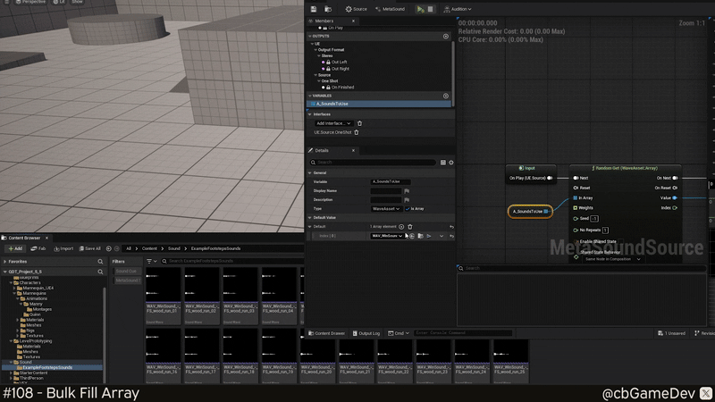For today’s example, I have a pretend footstep setup in Meta Sound Source. We are playing a random sound which is being fed by randomly selecting from an array. In this situation, we would likely want to have a large number of footstep samples to create a nice variety.