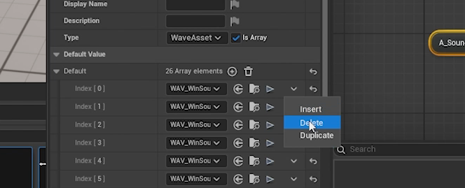 Now, an important thing to know about doing this is that it ADDS to the end of the array; it does not replace the array. This is important to know because otherwise, you may get duplicates or assets you were not expecting. For example, below you can see that although I dragged in 25 audio assets. However, I actually have 26 elements in the array because there was one asset already present when I bulk added. So I need to remove the offender from the array.