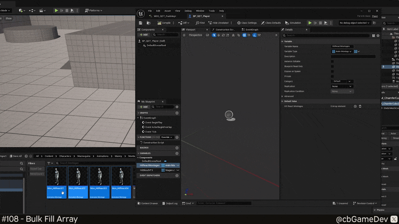 A great thing about this is it seems to work everywhere you have an array. Imagine we're doing hit reacts and have a lot of variants that we need to add. Below you can see me quickly adding a bunch of montages to an array of montages in my pawn.