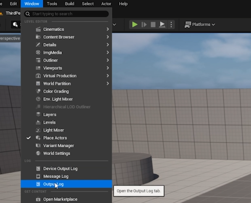 For today’s example, first we need to open up the Output Log by going to the top menu and clicking Window → Output Log.
