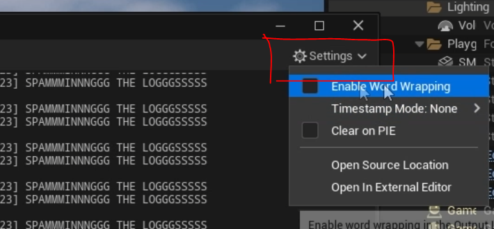 First up: Enable Word Wrapping. When this is turned on, any message that’s longer than the width of the Output Log will wrap onto the next line, as you can see in my GIF below. Personally, I’m not a fan. I find it makes things harder to read, so I usually leave it disabled.